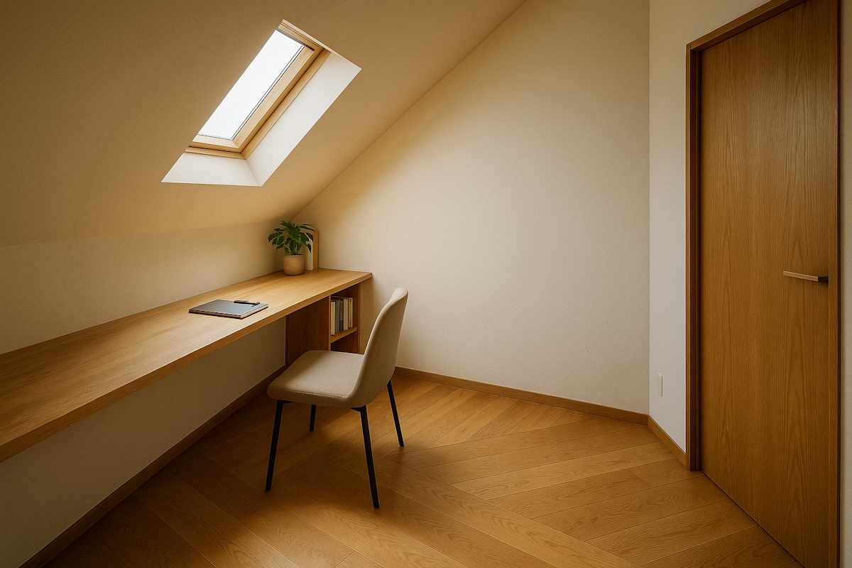 天窓から光が入り、造作デスクを壁に沿わせることで、狭さが“集中しやすさ”に変わるのが魅力です。