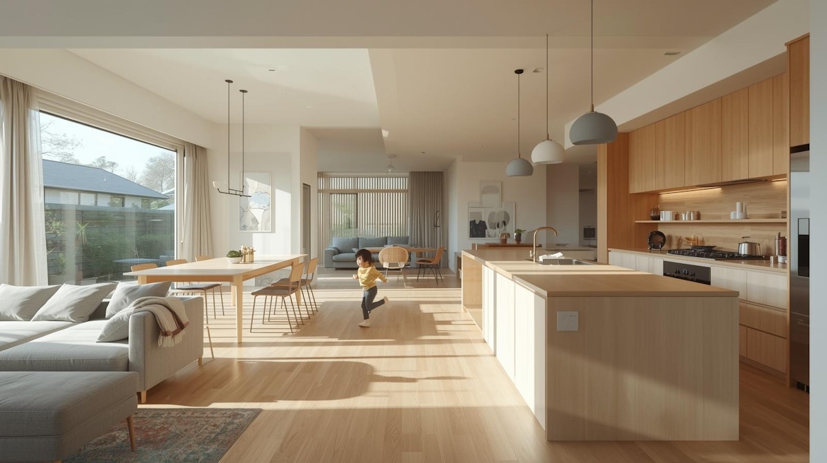 もう少し広いLDKの例では、キッチン・ダイニング・リビングがゆるやかにつながり、子どもが思わず走り回りたくなるような回遊性が生まれています。